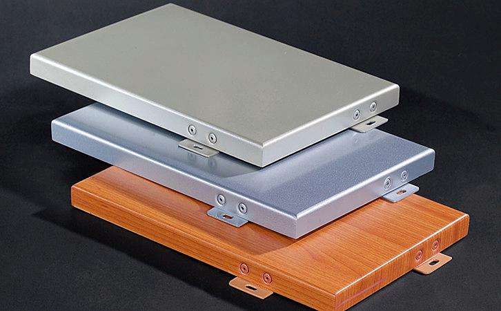 材質復合鋁板——兩層0.5mm厚純鋁板中間夾PVC或PEC塑料輥壓,熱合而成。鋁合金單板——2~3mm鋁合金板。氟碳涂層復合鋁板——一次性輥印而成,涂層厚一般為20μm。鋁合金單板
